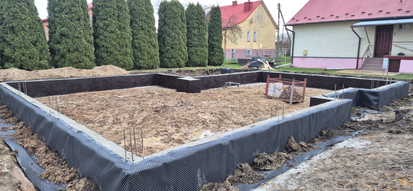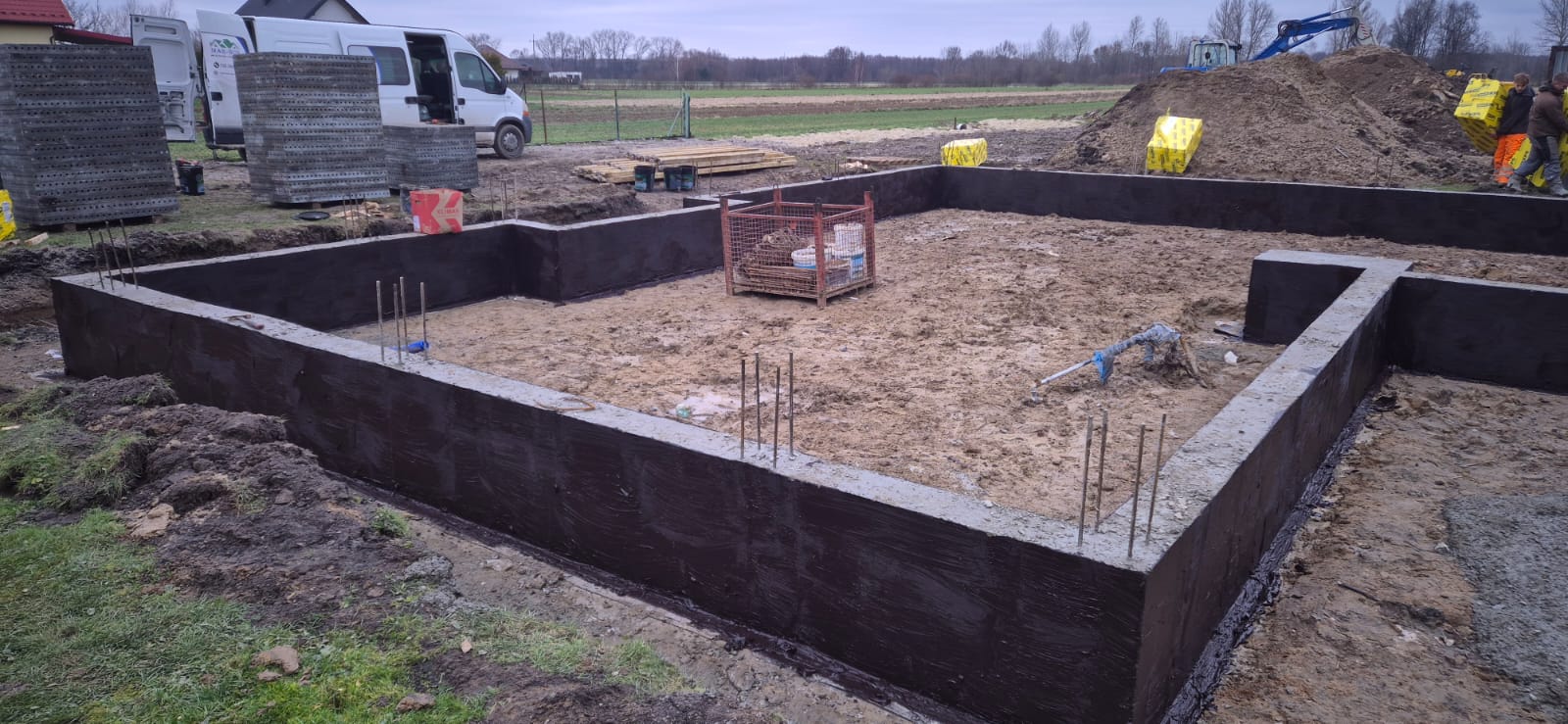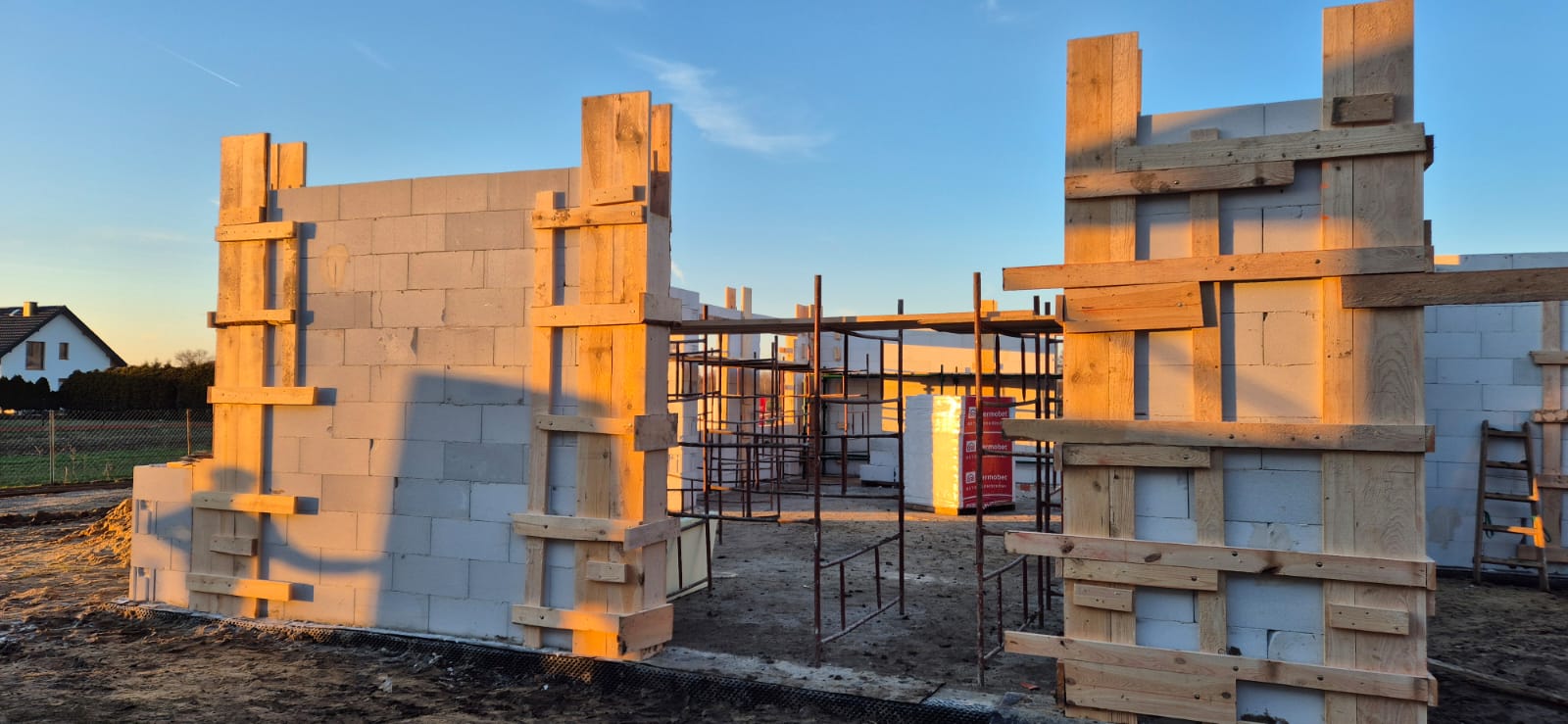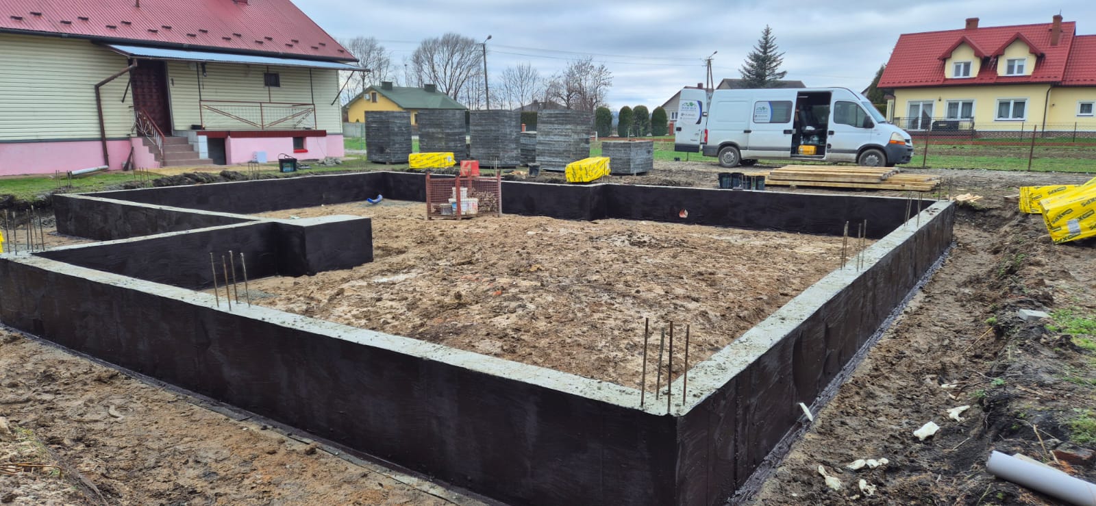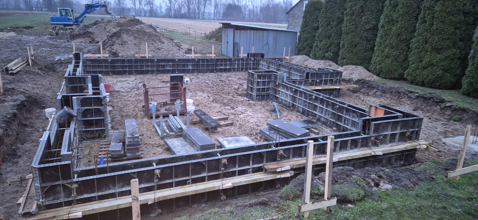 Pierwszy etap inwestycji obejmował niwelację terenu oraz wykonanie robót ziemnych pod fundamenty. Wykonano wykopy pod ławy fundamentowe, które następnie zostały zbrojone i zalane betonem bezpośrednio w gruncie. Kolejnym krokiem była budowa ścian fundamentowych – wykonana z wykorzystaniem szalunku systemowego, który umożliwił precyzyjne odwzorowanie kształtu ścian. Po zbrojeniu całość została zalana betonem, a następnie szalunki zostały rozebrane i dokładnie oczyszczone.