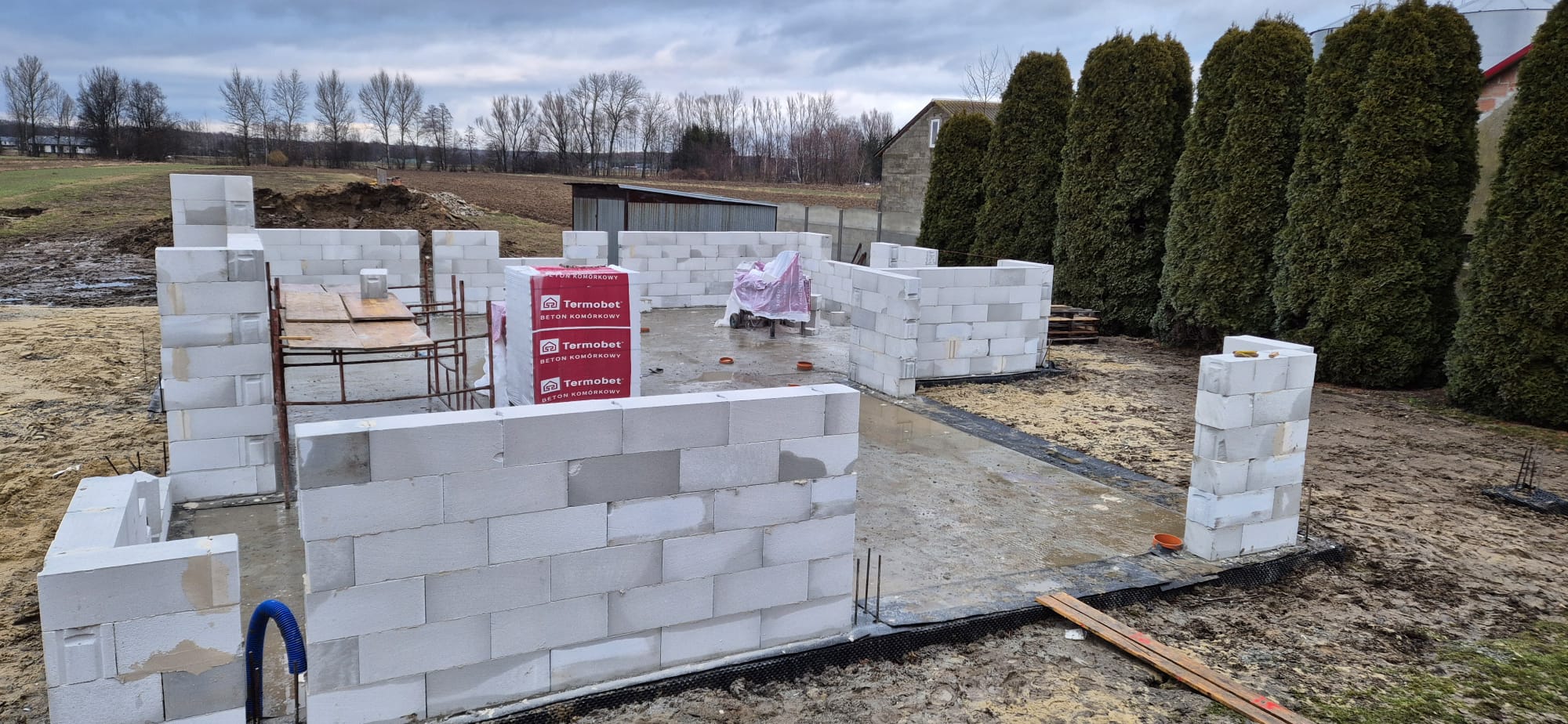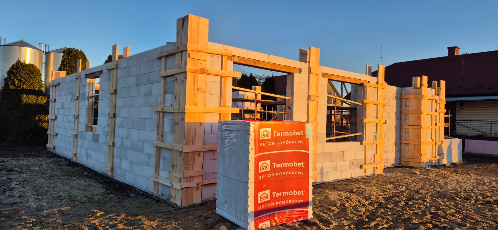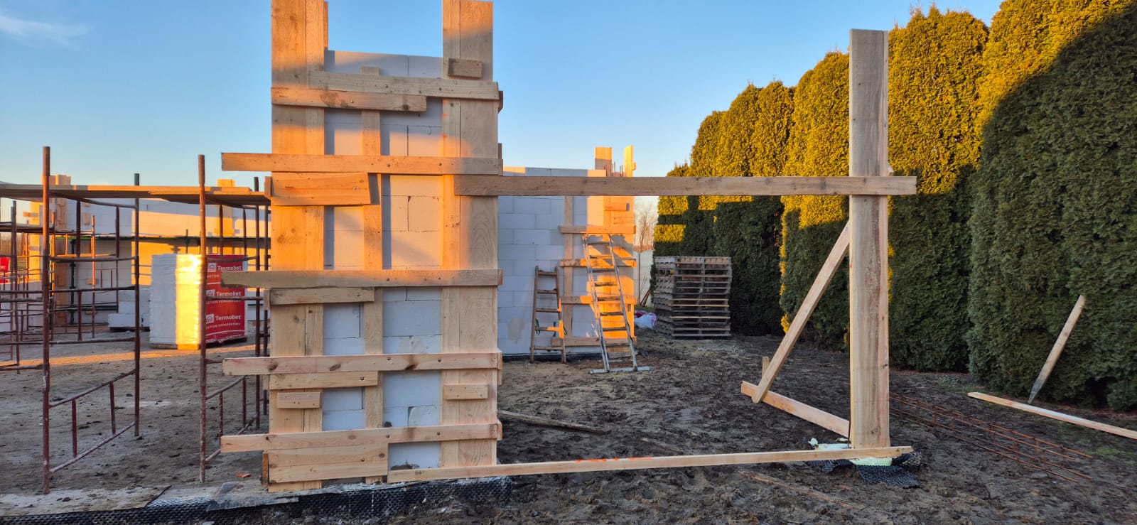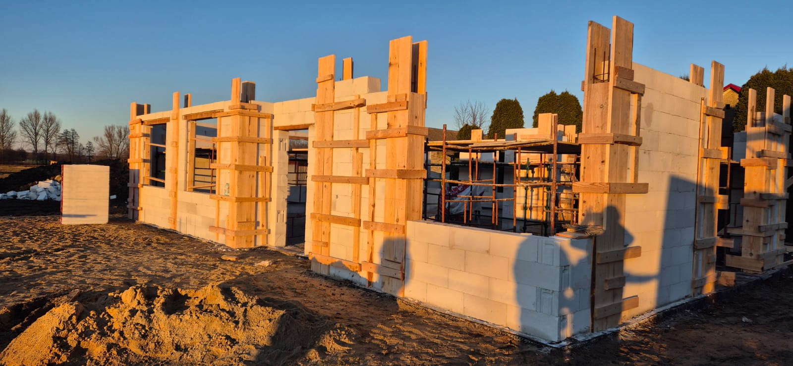 Pierwszy etap inwestycji obejmował niwelację terenu oraz wykonanie robót ziemnych pod fundamenty. Wykonano wykopy pod ławy fundamentowe, które następnie zostały zbrojone i zalane betonem bezpośrednio w gruncie. Kolejnym krokiem była budowa ścian fundamentowych – wykonana z wykorzystaniem szalunku systemowego, który umożliwił precyzyjne odwzorowanie kształtu ścian. Po zbrojeniu całość została zalana betonem, a następnie szalunki zostały rozebrane i dokładnie oczyszczone.