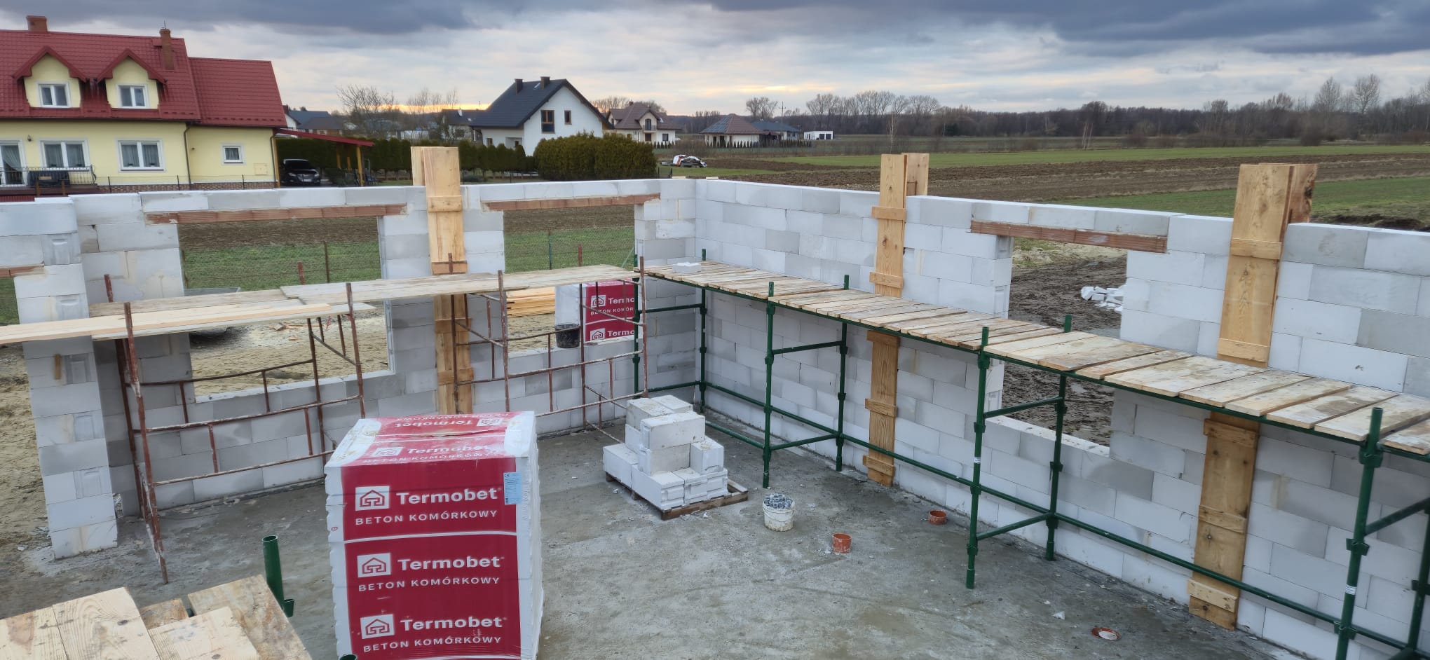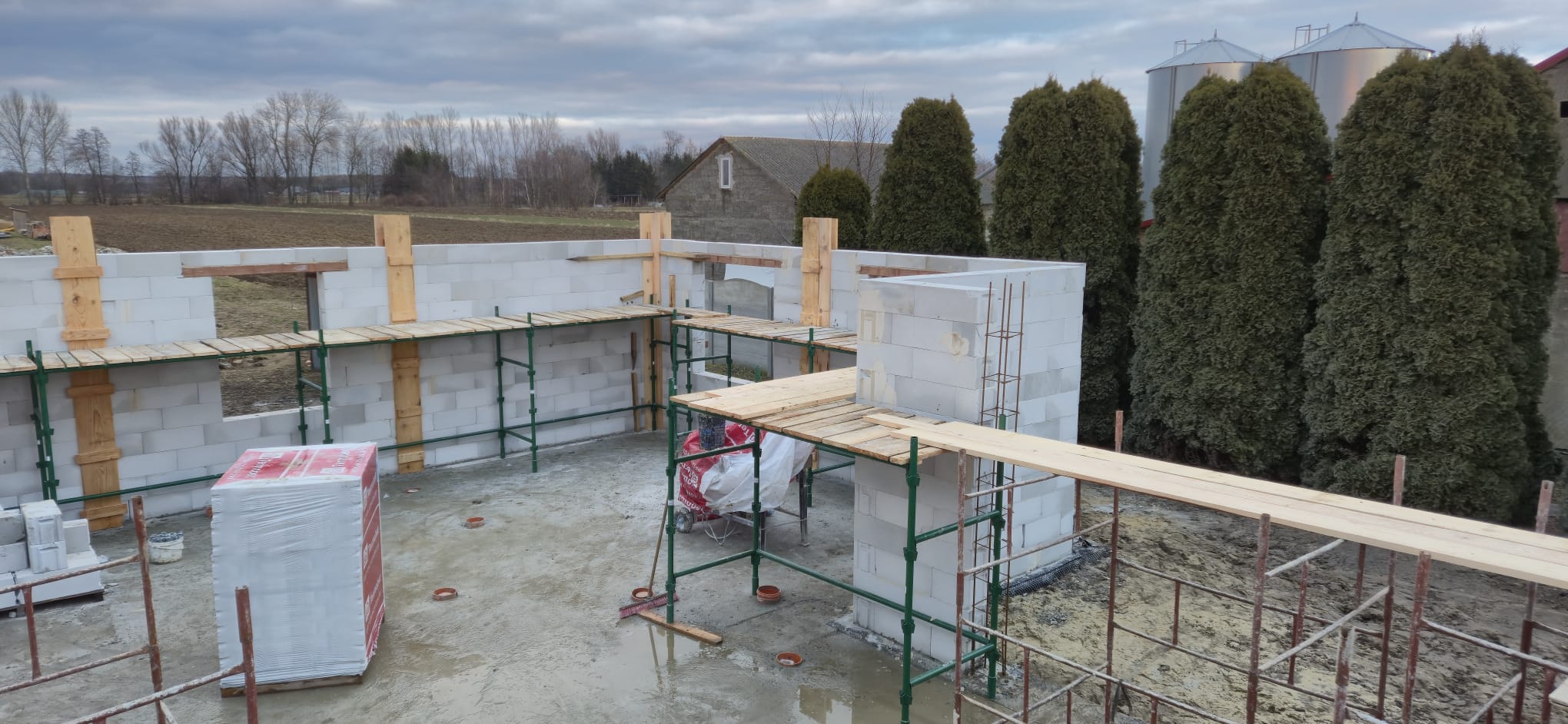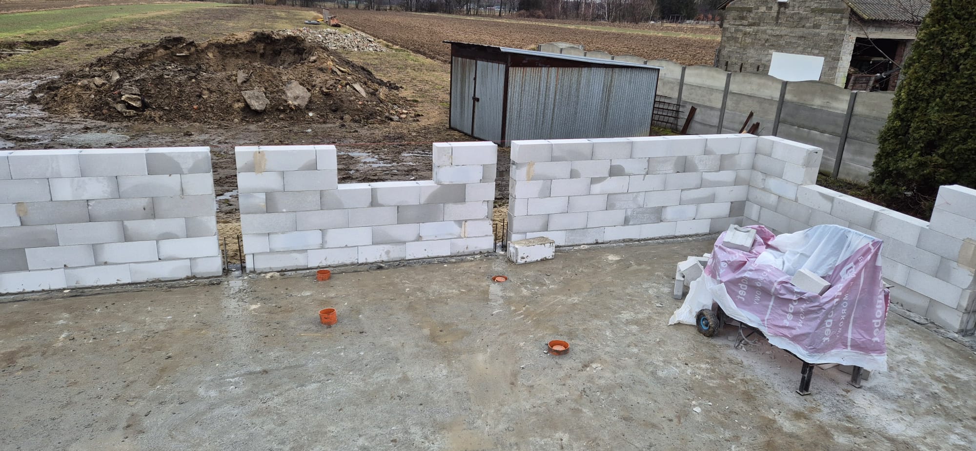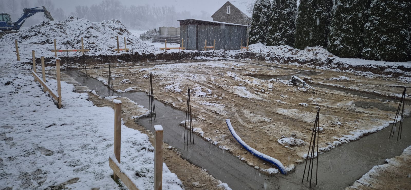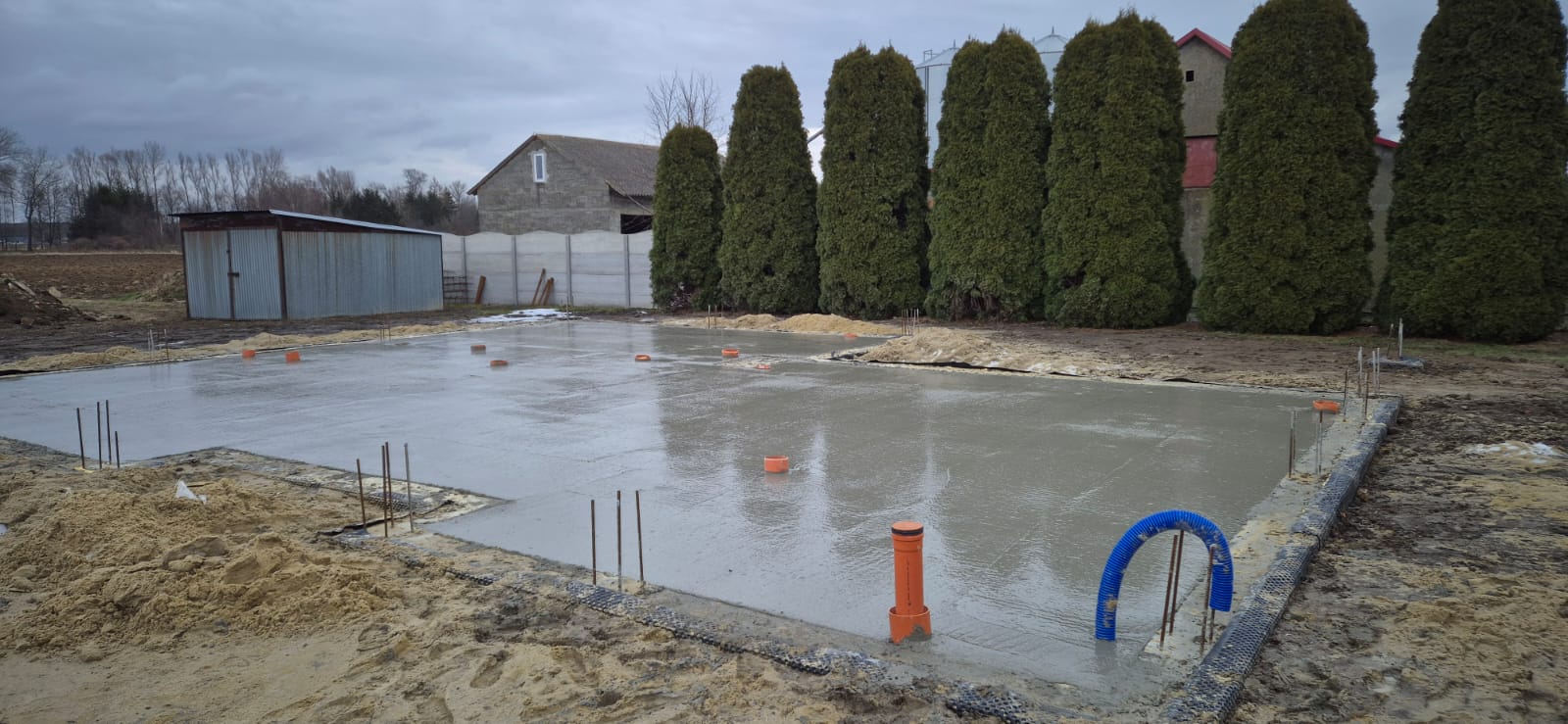 Pierwszy etap inwestycji obejmował niwelację terenu oraz wykonanie robót ziemnych pod fundamenty. Wykonano wykopy pod ławy fundamentowe, które następnie zostały zbrojone i zalane betonem bezpośrednio w gruncie. Kolejnym krokiem była budowa ścian fundamentowych – wykonana z wykorzystaniem szalunku systemowego, który umożliwił precyzyjne odwzorowanie kształtu ścian. Po zbrojeniu całość została zalana betonem, a następnie szalunki zostały rozebrane i dokładnie oczyszczone.