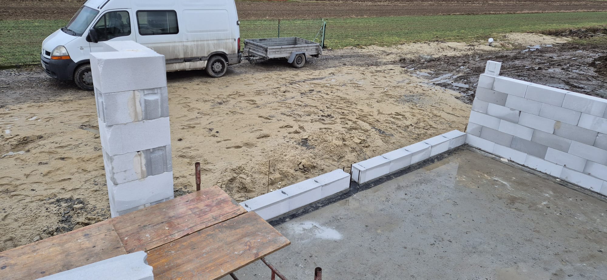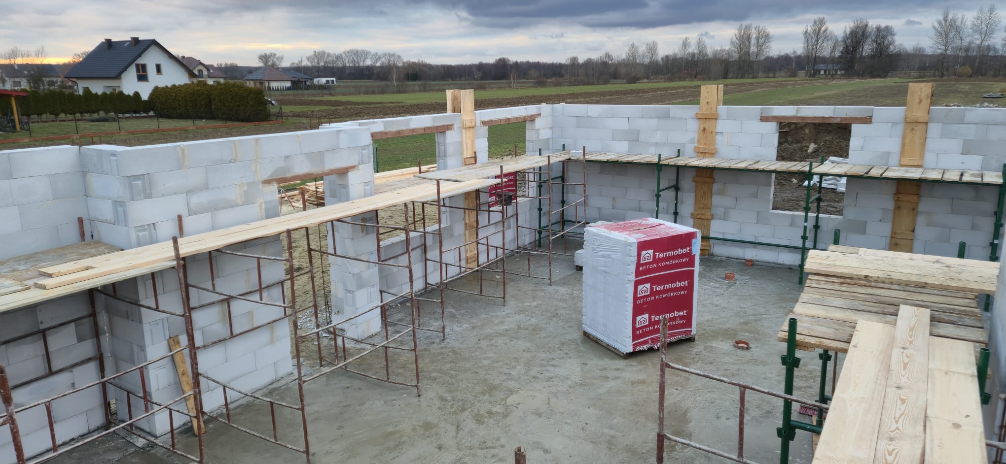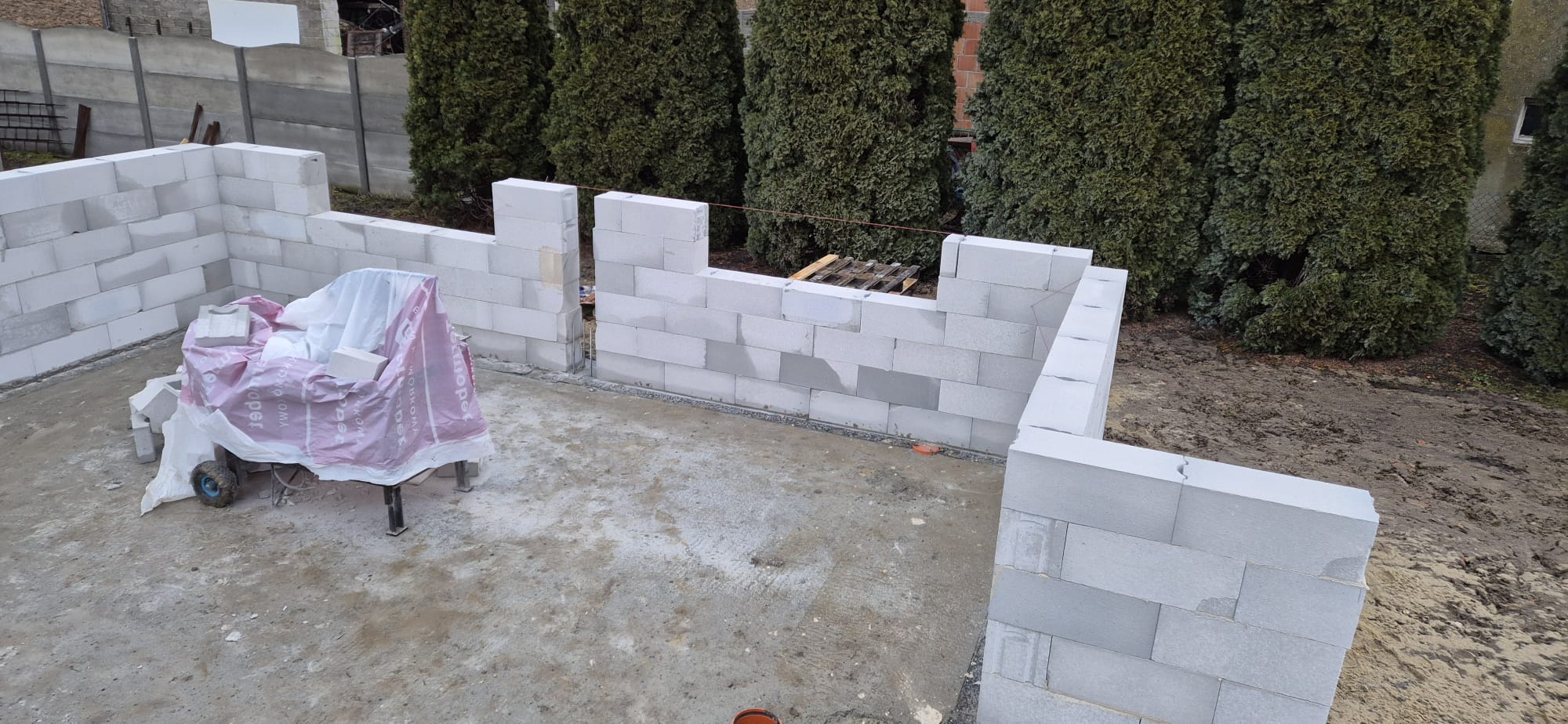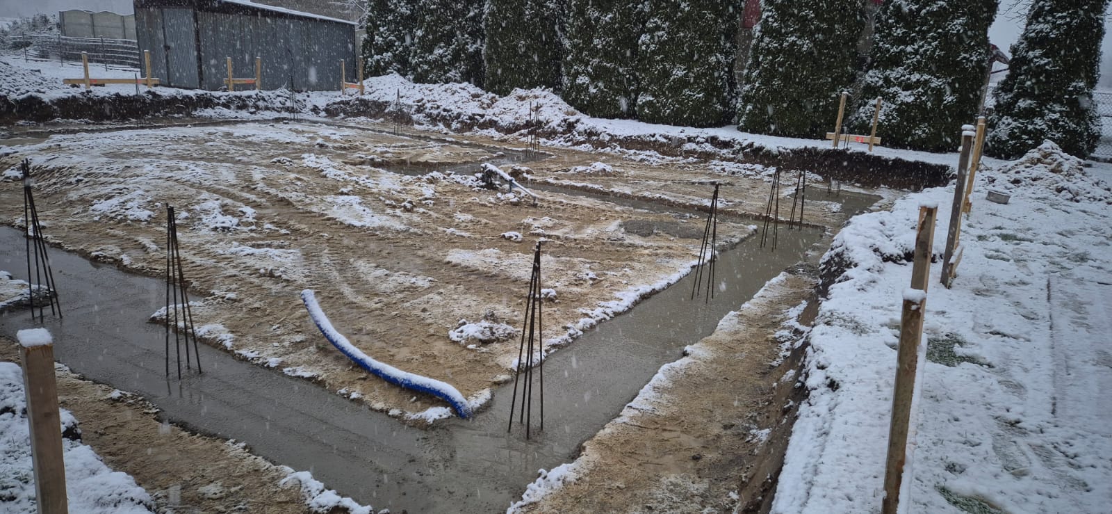 Pierwszy etap inwestycji obejmował niwelację terenu oraz wykonanie robót ziemnych pod fundamenty. Wykonano wykopy pod ławy fundamentowe, które następnie zostały zbrojone i zalane betonem bezpośrednio w gruncie. Kolejnym krokiem była budowa ścian fundamentowych – wykonana z wykorzystaniem szalunku systemowego, który umożliwił precyzyjne odwzorowanie kształtu ścian. Po zbrojeniu całość została zalana betonem, a następnie szalunki zostały rozebrane i dokładnie oczyszczone.
