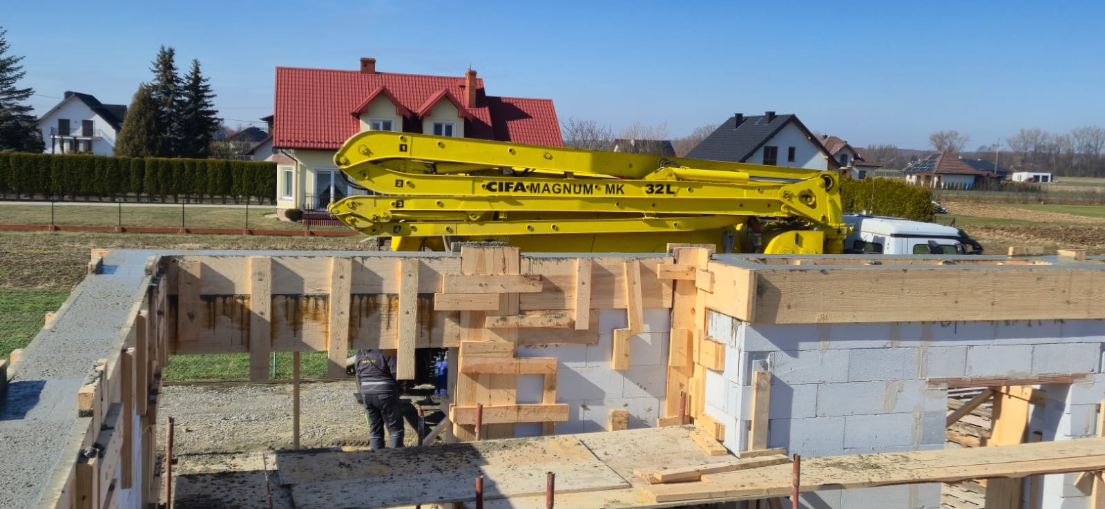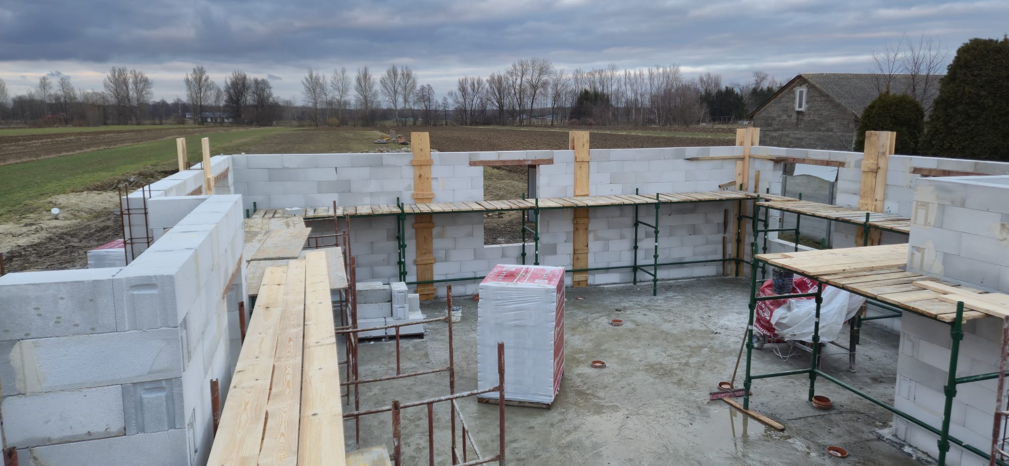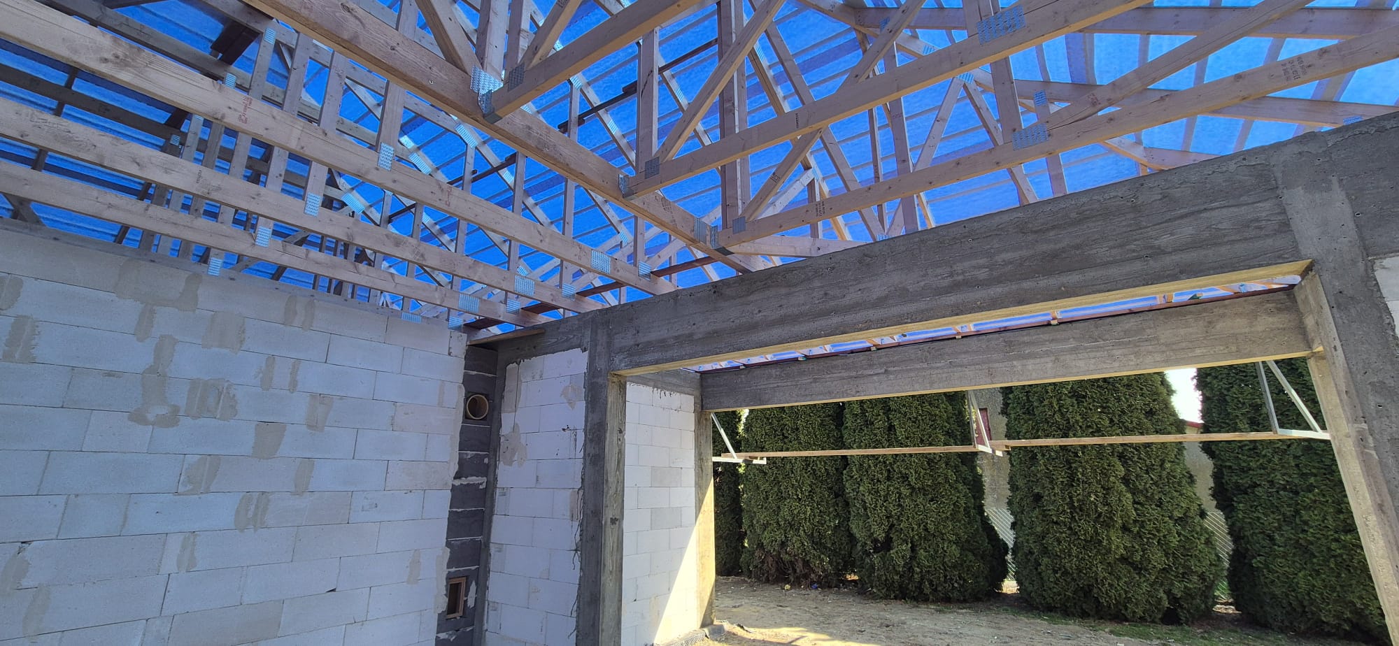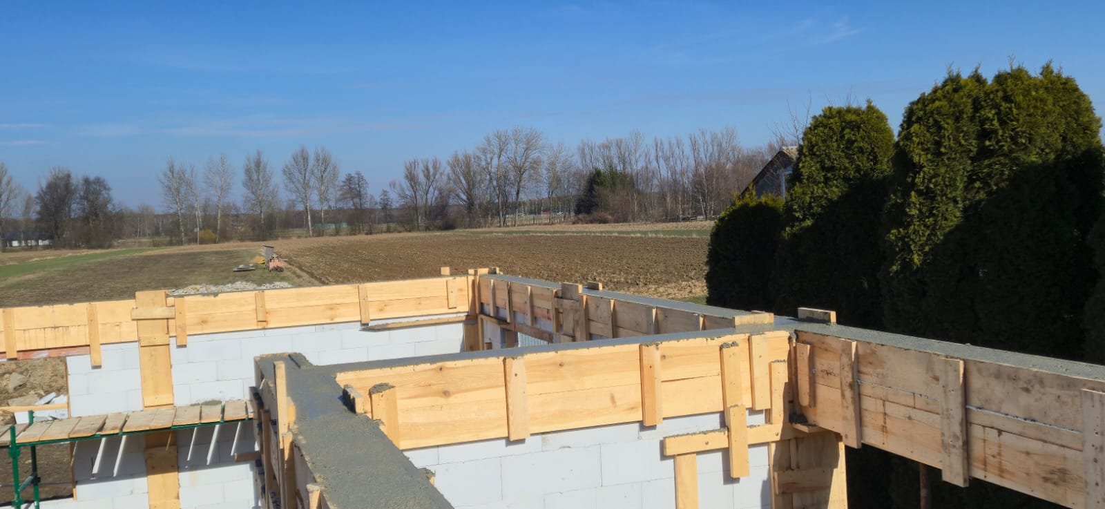 • Wieniec: Wykonujemy wieniec żelbetowy, który stanowi element usztywniający konstrukcję budynku oraz przygotowanie pod montaż dachu z wiązarów. Wieniec zapewni równomierne przeniesienie obciążeń dachu na ściany nośne oraz odpowiednią stabilność całej konstrukcji.