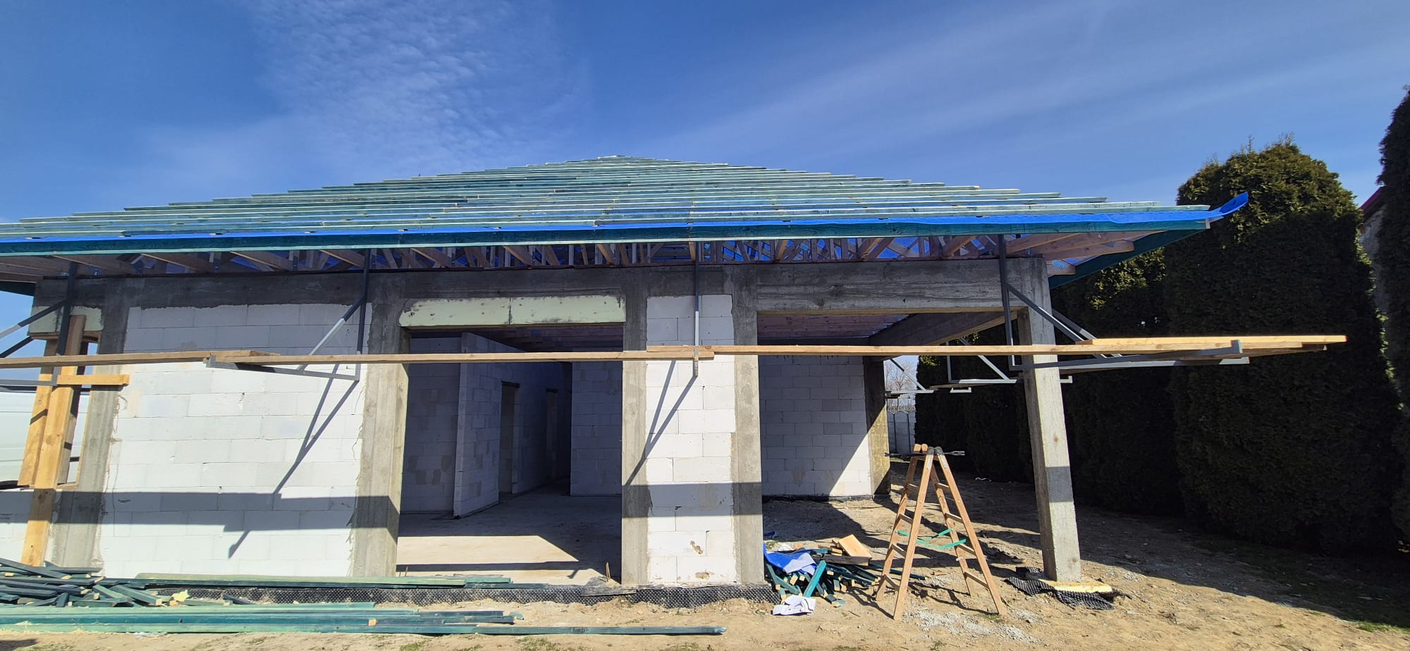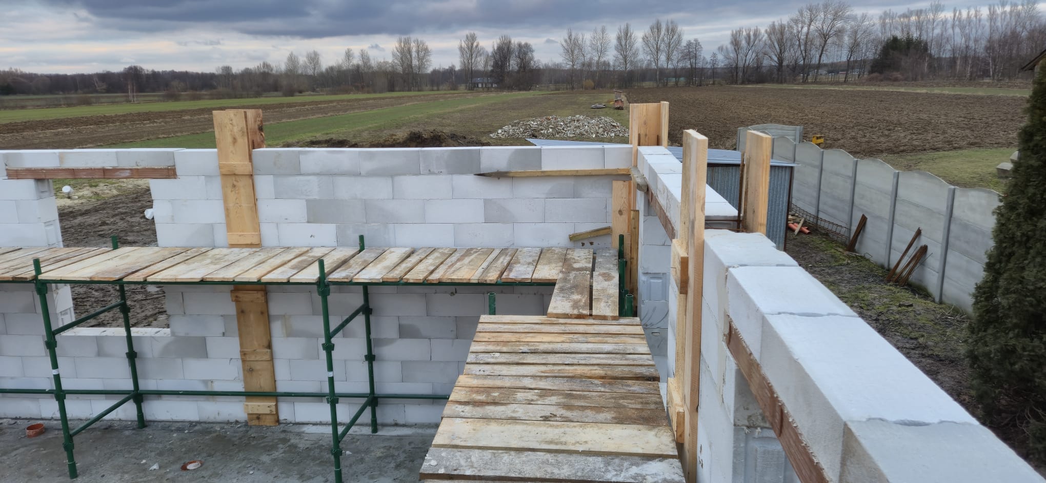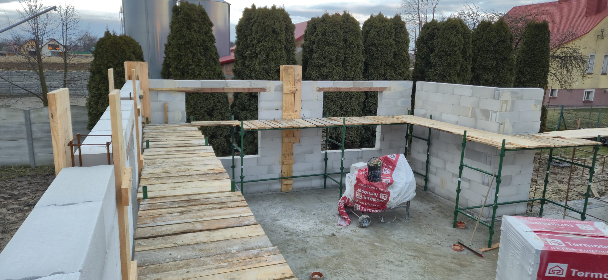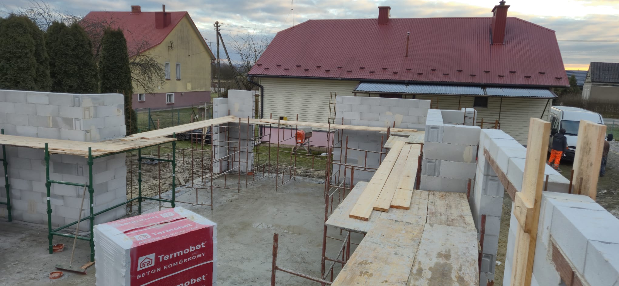 • Wieniec: Wykonujemy wieniec żelbetowy, który stanowi element usztywniający konstrukcję budynku oraz przygotowanie pod montaż dachu z wiązarów. Wieniec zapewni równomierne przeniesienie obciążeń dachu na ściany nośne oraz odpowiednią stabilność całej konstrukcji.