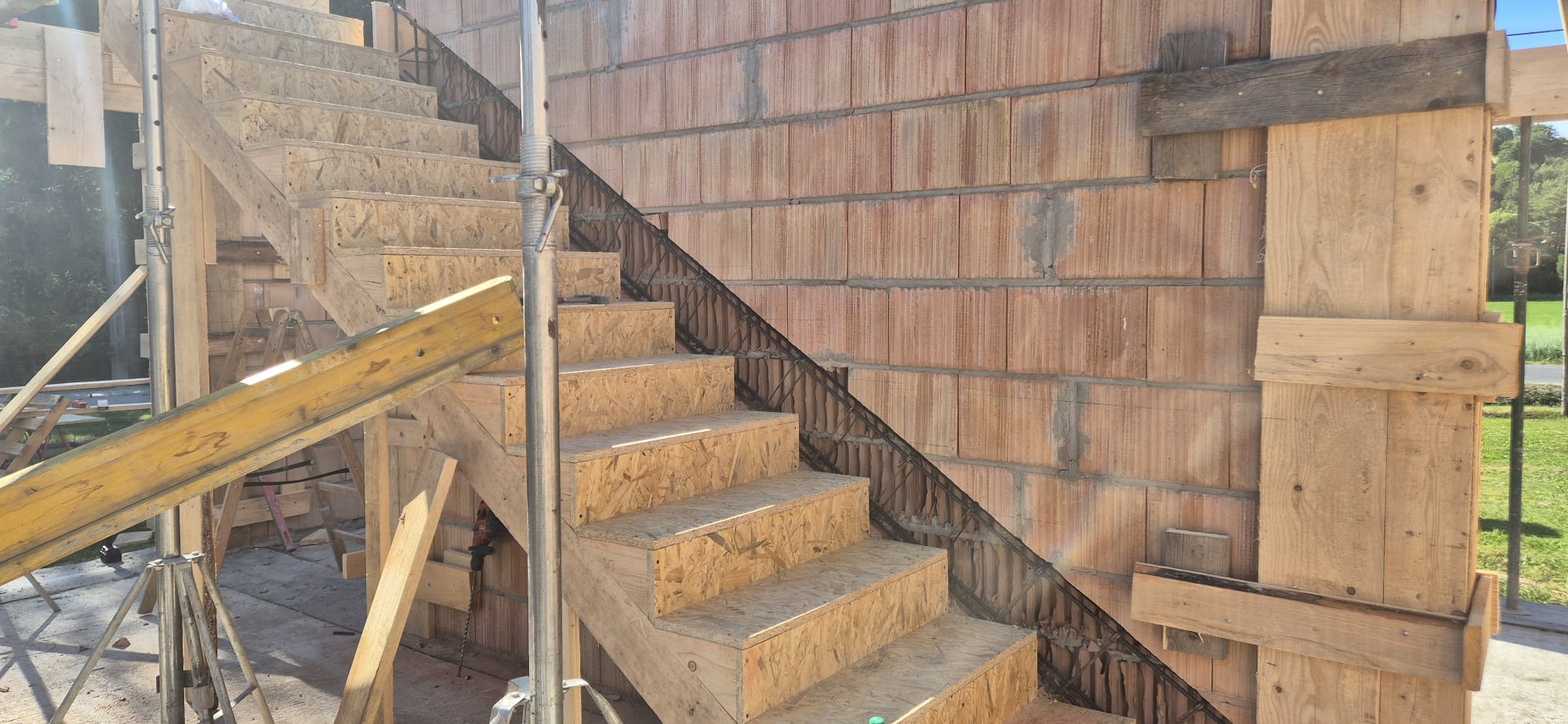 Następnie zrealizowano monolityczny strop żelbetowy, wylewany na pełnym deskowaniu, zbrojony zgodnie z projektem konstrukcyjnym. Strop ten stanowi integralny element nośny budynku, zapewniając jego stateczność przestrzenną.